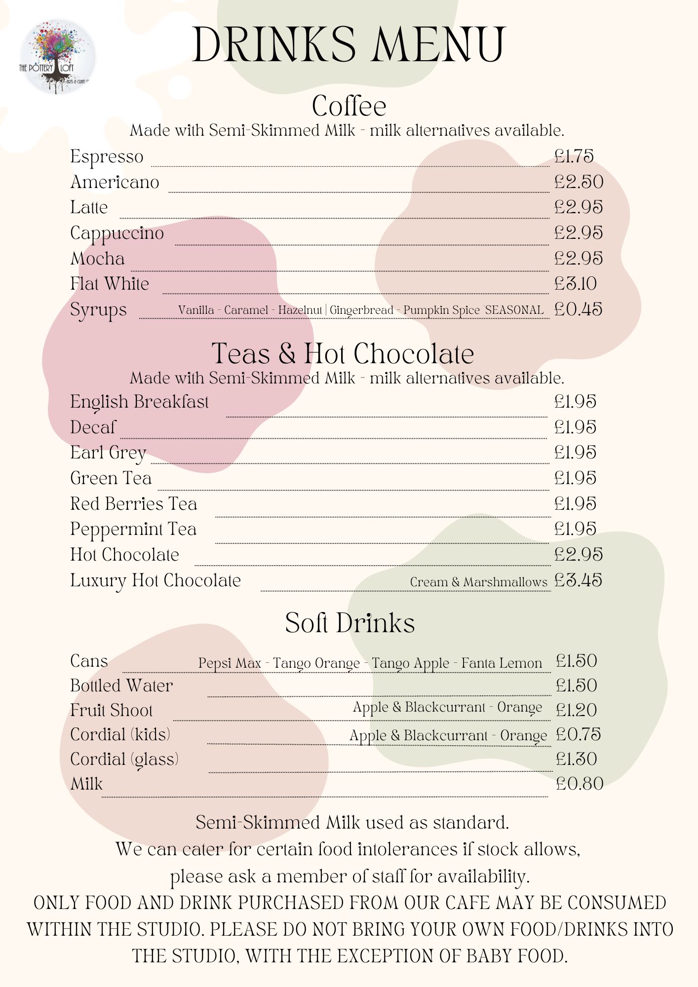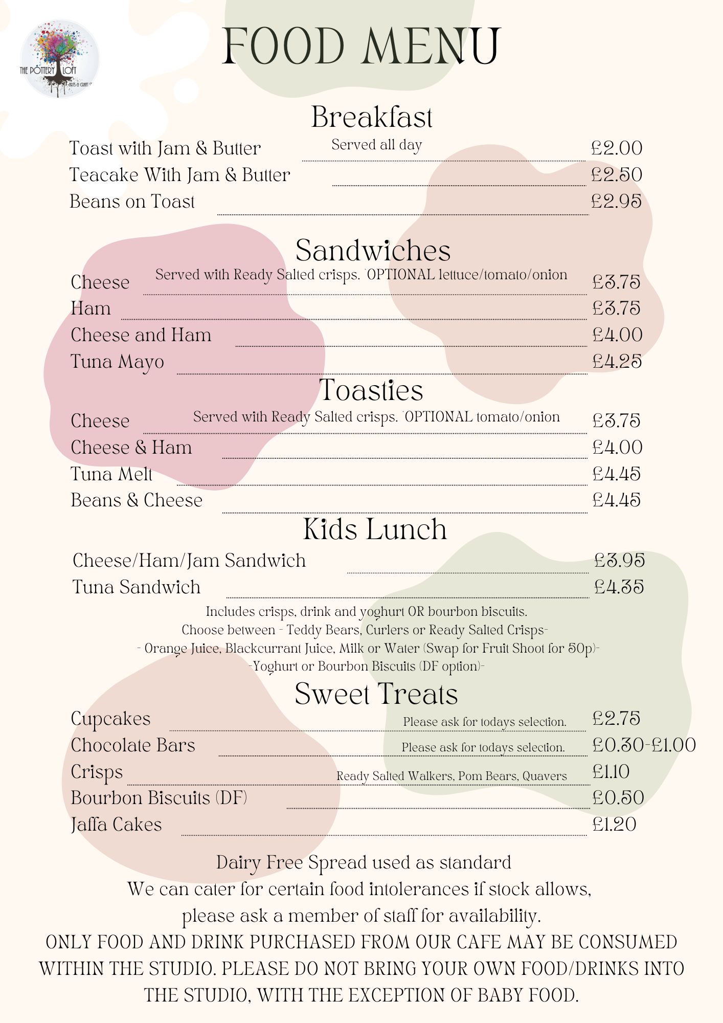 Only food and drinks purchased from our cafe may be consumed within the studio (with the exception of baby food).