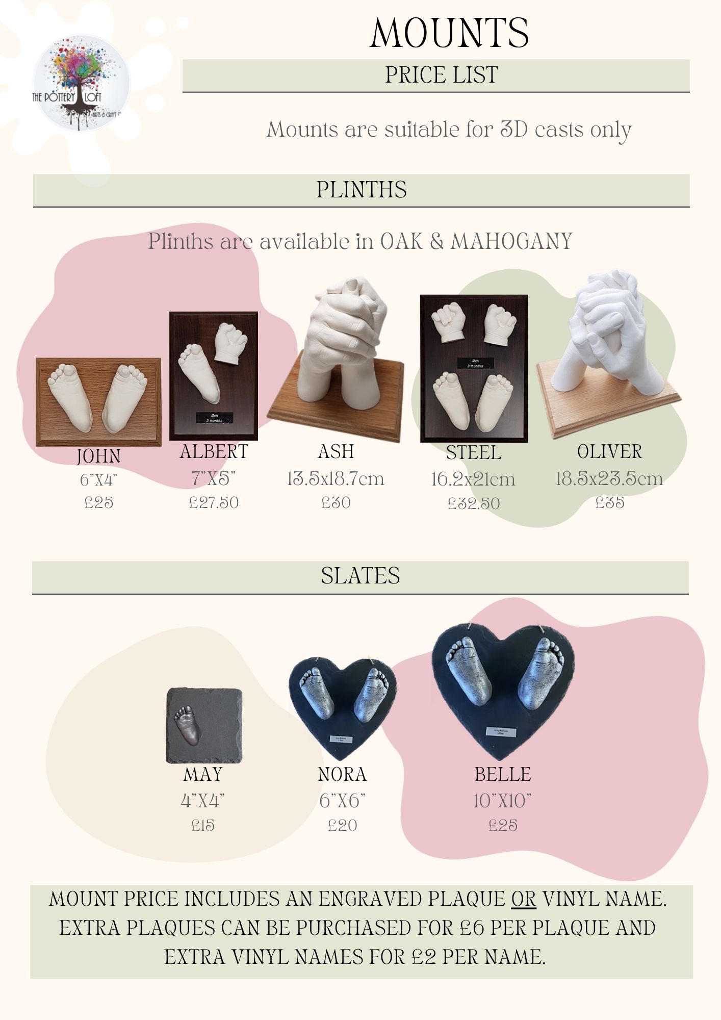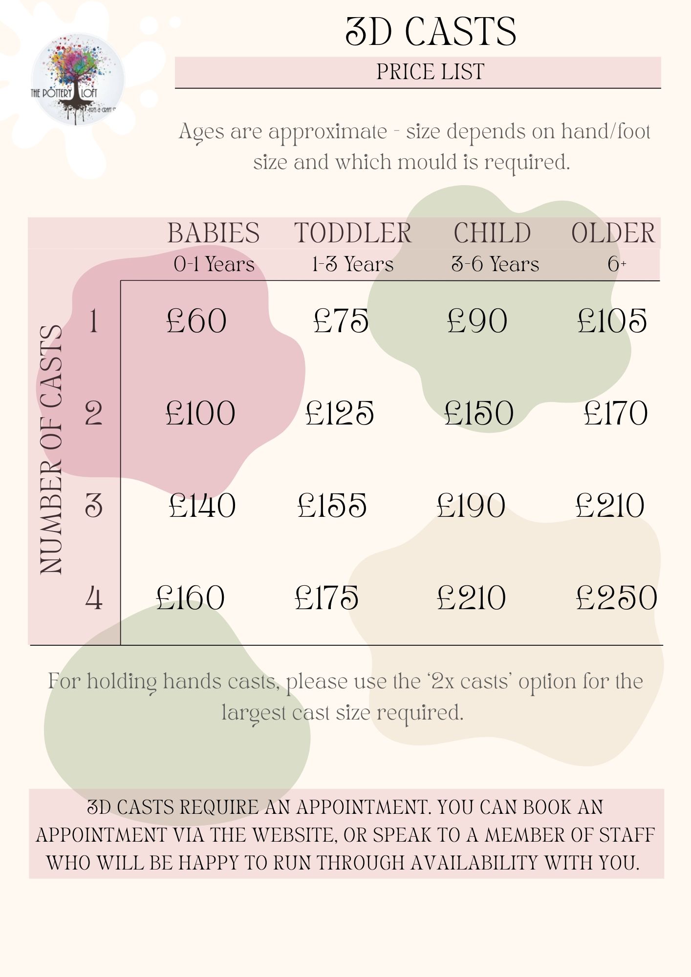 Take a look at our price list and examples below, and book your appointment online to visit our studio and create your own 3D cast keepsake.